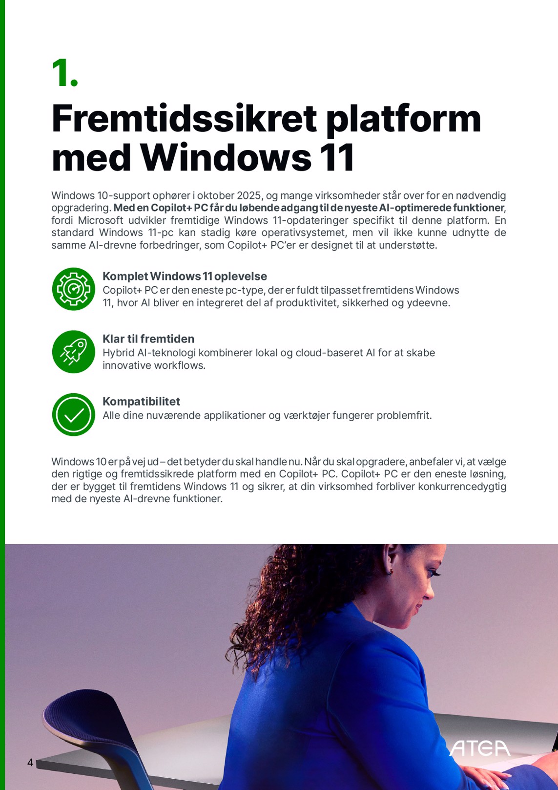 1. Fremtidssikret platform med Windows 11 Windows 10-support ophører i oktober 2025, og mange virksomheder står over for en nødvendig opgradering. Med en Copilot+ PC får du løbende adgang til de nyeste AI-optimerede funktioner , fordi Microsoft udvikler fremtidige Windows 11-opdateringer specifikt til denne platform. En standard Windows 11-pc kan stadig køre operativsystemet, men vil ikke kunne udnytte de samme AI-drevne forbedringer, som Copilot+ PC’er er designet til at understøtte. Komplet Windows 11 oplevelse Copilot+ PC er den eneste pc-type, der er fuldt tilpasset fremtidens Windows 11, hvor AI bliver en integreret del af produktivitet, sikkerhed og ydeevne. Klar til fremtiden Hybrid AI-teknologi kombinerer lokal og cloud-baseret AI for at skabe innovative workflows. Kompatibilitet Alle dine nuværende applikationer og værktøjer fungerer problemfrit. Windows 10 er på vej ud – det betyder du skal handle nu. Når du skal opgradere, anbefaler vi, at vælge den rigtige og fremtidssikrede platform med en Copilot+ PC. Copilot+ PC er den eneste løsning, der er bygget til fremtidens Windows 11 og sikrer, at din virksomhed forbliver konkurrencedygtig med de nyeste AI-drevne funktioner. 4