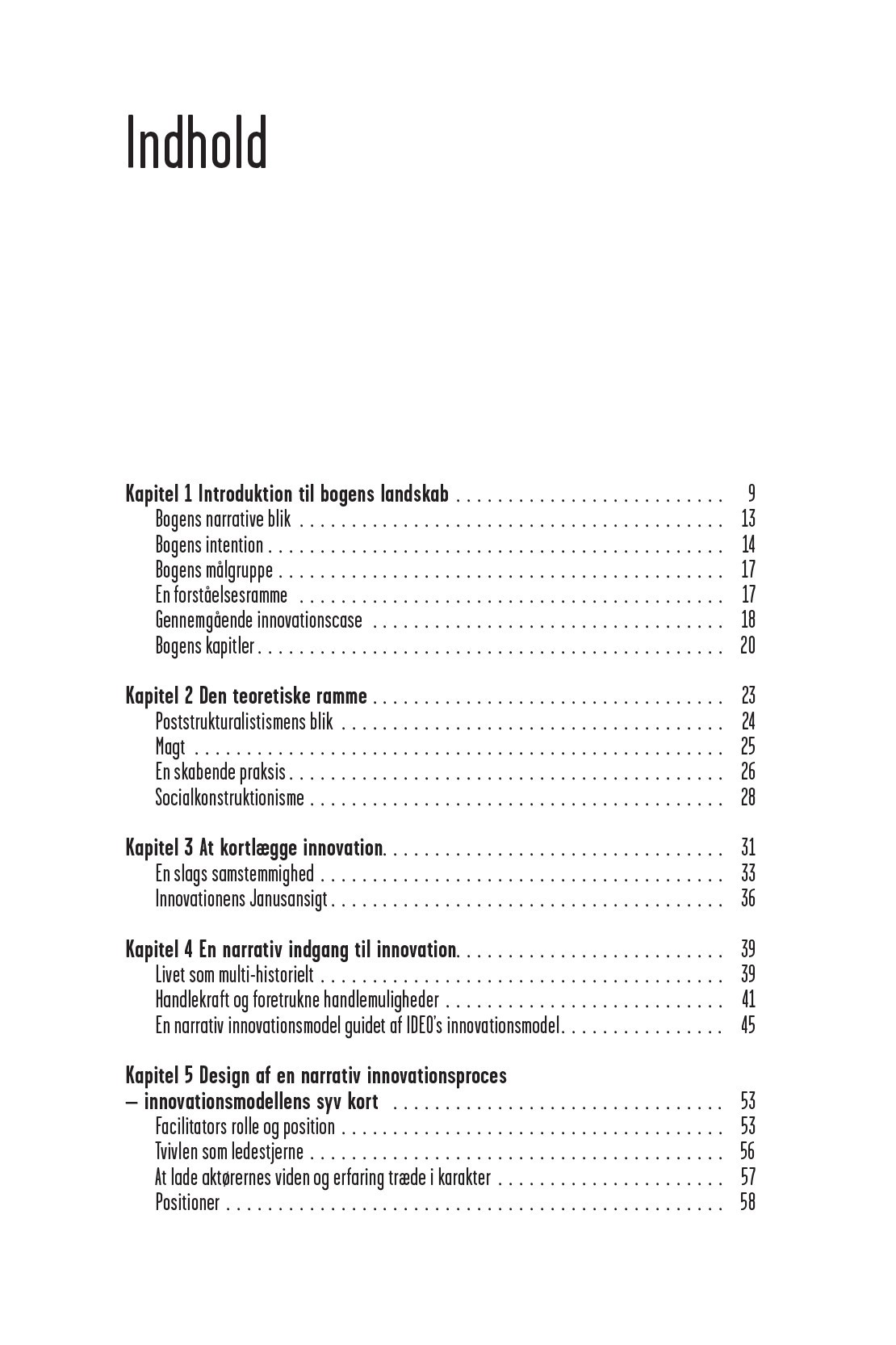 Indhold Kapitel 1 Introduktion til bogens landskab Bogens narrative blik Bogens intention Bogens målgruppe En forståelsesramme Gennemgående innovationscase Bogens kapitler Kapitel 2 Den teoretiske ramme Poststrukturalistismens blik Magt En skabende praksis Socialkonstruktionisme Kapitel 3 At kortlægge innovation En slags samstemmighed Innovationens Janusansigt Kapitel 4 En narrativ indgang til innovation Livet som multi-historielt Handlekraft og foretrukne handlemuligheder En narrativ innovationsmodel guidet af IDEO’s innovationsmodel Kapitel 5 Design af en narrativ innovationsproces – innovationsmodellens syv kort Facilitators rolle og position Tvivlen som ledestjerne At lade aktørernes viden og erfaring træde i karakter Positioner 9 13 14 17 17 18 20 23 24 25 26 28 31 33 36 39 39 41 45 53 53 56 57 58