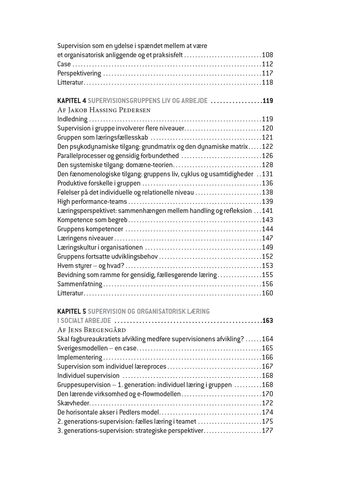 Et udvidet supervisionsbegreb . . . . . . . . . . . . . . . . . . . . . . . . . . . . . . . . . . . . . . . . . .183 Afslutning . . . . . . . . . . . . . . . . . . . . . . . . . . . . . . . . . . . . . . . . . . . . . . . . . . . . . . . . . . . . . . .184 Litteratur. . . . . . . . . . . . . . . . . . . . . . . . . . . . . . . . . . . . . . . . . . . . . . . . . . . . . . . . . . . . . . . .185 KAPITEL 6 MENTALISERINGSBASERET SUPERVISION AF LEDERGRUPPER I EN STRATEGISK UDVIKLINGSPROCES . . . . . . . . . . . . . . . . . . . . . . . . . . . . . . . .187 Af Lone Willer Holm Introduktion. . . . . . . . . . . . . . . . . . . . . . . . . . . . . . . . . . . . . . . . . . . . . . . . . . . . . . . . . . . . .187 Ledergruppen som katalysator i en strategisk udviklingsproces . . . . . . . . . .188 Arbejdet med ledergruppen. . . . . . . . . . . . . . . . . . . . . . . . . . . . . . . . . . . . . . . . . . . . . .198 5 Behaviors of a Cohesive Team. . . . . . . . . . . . . . . . . . . . . . . . . . . . . . . . . . . . . . . . . .202 Mentalisering i ledergrupper . . . . . . . . . . . . . . . . . . . . . . . . . . . . . . . . . . . . . . . . . . . . .204 Konklusion. . . . . . . . . . . . . . . . . . . . . . . . . . . . . . . . . . . . . . . . . . . . . . . . . . . . . . . . . . . . . .219 Litteratur. . . . . . . . . . . . . . . . . . . . . . . . . . . . . . . . . . . . . . . . . . . . . . . . . . . . . . . . . . . . . . . .221 KAPITEL 7 KOLLEGIAL SUPERVISION – HVAD OG HVORDAN?. . . . . . . . . . . . 223 Af Jens Bregengård og Jakob Hassing Pedersen Når kolleger skaber læring for og med hinanden. . . . . . . . . . . . . . . . . . . . . . . . . .223 Konstruktive forstyrrelser i hverdagens arbejde. . . . . . . . . . . . . . . . . . . . . . . . . .224 Udgangspunktet er supervisandens behov og forståelse . . . . . . . . . . . . . . . . .227 Faser i supervisionsprocessen . . . . . . . . . . . . . . . . . . . . . . . . . . . . . . . . . . . . . . . . . .228 Spilleregler for interviewet. . . . . . . . . . . . . . . . . . . . . . . . . . . . . . . . . . . . . . . . . . . . . . .230 Spilleregler for det reflekterende team . . . . . . . . . . . . . . . . . . . . . . . . . . . . . . . . . . .231 Gruppen udvælger teknikker, som trænes. . . . . . . . . . . . . . . . . . . . . . . . . . . . . . . .232 Kontekstafklaring – enighed og fælles forståelse . . . . . . . . . . . . . . . . . . . . . . . .233 Opsamling og afslutning. . . . . . . . . . . . . . . . . . . . . . . . . . . . . . . . . . . . . . . . . . . . . . . . .235 Litteratur. . . . . . . . . . . . . . . . . . . . . . . . . . . . . . . . . . . . . . . . . . . . . . . . . . . . . . . . . . . . . . . .236 KAPITEL 8 PROFESSIONERNES ARBEJDE MED NY VELFÆRD. . . . . . . . . . . . 237 Af Elvi Weinreich Indledning . . . . . . . . . . . . . . . . . . . . . . . . . . . . . . . . . . . . . . . . . . . . . . . . . . . . . . . . . . . . . .237 Kapitlets struktur. . . . . . . . . . . . . . . . . . . . . . . . . . . . . . . . . . . . . . . . . . . . . . . . . . . . . . . .238 Baggrund – Velfærd på dagsordenen . . . . . . . . . . . . . . . . . . . . . . . . . . . . . . . . . . . .238 Velfærdssamfund – velfærdsregime og velfærdsmodeller . . . . . . . . . . . . . . .241 Professioner og velfærdssamfund . . . . . . . . . . . . . . . . . . . . . . . . . . . . . . . . . . . . . . .244 Diskursanalyse af den politiske velfærdstænkning. . . . . . . . . . . . . . . . . . . . . . .247 Den politiske velfærdsdiskurs på slingrekurs 2001-2015 . . . . . . . . . . . . . . . .249 Velfærdsprofessionernes udfordringer med at realisere Ny velfærd. . . . . . .256 Hvordan kan et professionsidentitetsskift faciliteres? . . . . . . . . . . . . . . . . . . .259 Litteratur. . . . . . . . . . . . . . . . . . . . . . . . . . . . . . . . . . . . . . . . . . . . . . . . . . . . . . . . . . . . . . . .261 STIKORD . . . . . . . . . . . . . . . . . . . . . . . . . . . . . . . . . . . . . . . . . . . . . . . . . . . . . . . . . 266