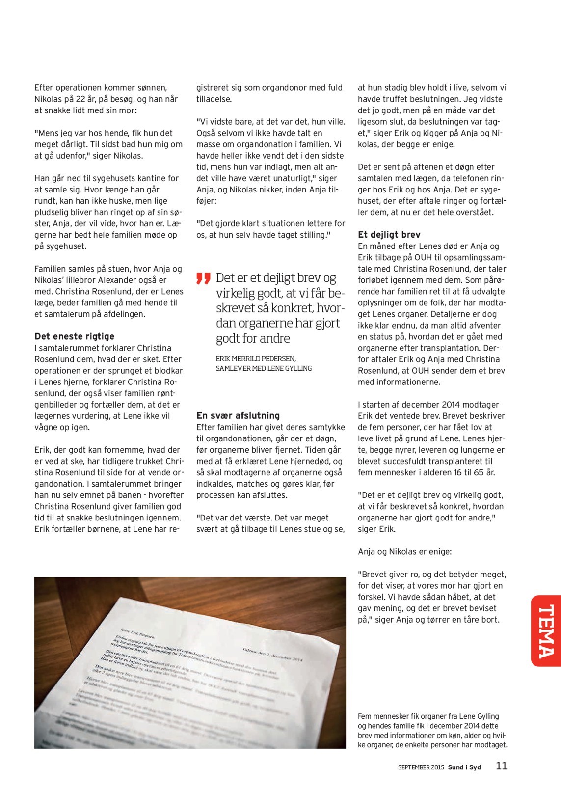 Efter operationen kommer sønnen, Nikolas på 22 år, på besøg, og han når at snakke lidt med sin mor: "Mens jeg var hos hende, fik hun det meget dårligt. Til sidst bad hun mig om at gå udenfor," siger Nikolas. Han går ned til sygehusets kantine for at samle sig. Hvor længe han går rundt, kan han ikke huske, men lige pludselig bliver han ringet op af sin søster, Anja, der vil vide, hvor han er. Lægerne har bedt hele familien møde op på sygehuset. Familien samles på stuen, hvor Anja og Nikolas’ lillebror Alexander også er med. Christina Rosenlund, der er Lenes læge, beder familien gå med hende til et samtalerum på afdelingen. gistreret sig som organdonor med fuld tilladelse. "Vi vidste bare, at det var det, hun ville. Også selvom vi ikke havde talt en masse om organdonation i familien. Vi havde heller ikke vendt det i den sidste tid, mens hun var indlagt, men alt andet ville have været unaturligt," siger Anja, og Nikolas nikker, inden Anja tilføjer: "Det gjorde klart situationen lettere for os, at hun selv havde taget stilling." at hun stadig blev holdt i live, selvom vi havde truffet beslutningen. Jeg vidste det jo godt, men på en måde var det ligesom slut, da beslutningen var taget," siger Erik og kigger på Anja og Nikolas, der begge er enige. Det er sent på aftenen et døgn efter samtalen med lægen, da telefonen ringer hos Erik og hos Anja. Det er sygehuset, der efter aftale ringer og fortæller dem, at nu er det hele overstået. Et dejligt brev En måned efter Lenes død er Anja og Erik tilbage på OUH til opsamlingssamtale med Christina Rosenlund, der taler forløbet igennem med dem. Som pårørende har familien ret til at få udvalgte oplysninger om de folk, der har modtaget Lenes organer. Detaljerne er dog ikke klar endnu, da man altid afventer en status på, hvordan det er gået med organerne efter transplantation. Derfor aftaler Erik og Anja med Christina Rosenlund, at OUH sender dem et brev med informationerne. I starten af december 2014 modtager Erik det ventede brev. Brevet beskriver de fem personer, der har fået lov at leve livet på grund af Lene. Lenes hjerte, begge nyrer, leveren og lungerne er blevet succesfuldt transplanteret til fem mennesker i alderen 16 til 65 år. "Det er et dejligt brev og virkelig godt, at vi får beskrevet så konkret, hvordan organerne har gjort godt for andre," siger Erik. Anja og Nikolas er enige: "Brevet giver ro, og det betyder meget, for det viser, at vores mor har gjort en forskel. Vi havde sådan håbet, at det gav mening, og det er brevet beviset på," siger Anja og tørrer en tåre bort. Det eneste rigtige I samtalerummet forklarer Christina Rosenlund dem, hvad der er sket. Efter operationen er der sprunget et blodkar i Lenes hjerne, forklarer Christina Rosenlund, der også viser familien røntgenbilleder og fortæller dem, at det er lægernes vurdering, at Lene ikke vil vågne op igen. Erik, der godt kan fornemme, hvad der er ved at ske, har tidligere trukket Christina Rosenlund til side for at vende organdonation. I samtalerummet bringer han nu selv emnet på banen - hvorefter Christina Rosenlund giver familien god tid til at snakke beslutningen igennem. Erik fortæller børnene, at Lene har re- Det er et dejligt brev og virkelig godt, at vi får be skrevet så konkret, hvor dan organerne har gjort godt for andre ERIK MERRILD PEDERSEN, SAMLEVER MED LENE GYLLING En svær afslutning Efter familien har givet deres samtykke til organdonationen, går der et døgn, før organerne bliver fjernet. Tiden går med at få erklæret Lene hjernedød, og så skal modtagerne af organerne også indkaldes, matches og gøres klar, før processen kan afsluttes. "Det var det værste. Det var meget svært at gå tilbage til Lenes stue og se, TEMA Fem mennesker fik organer fra Lene Gylling og hendes familie fik i december 2014 dette brev med informationer om køn, alder og hvilke organer, de enkelte personer har modtaget. SEPTEMBER 2015 Sund i Syd 11